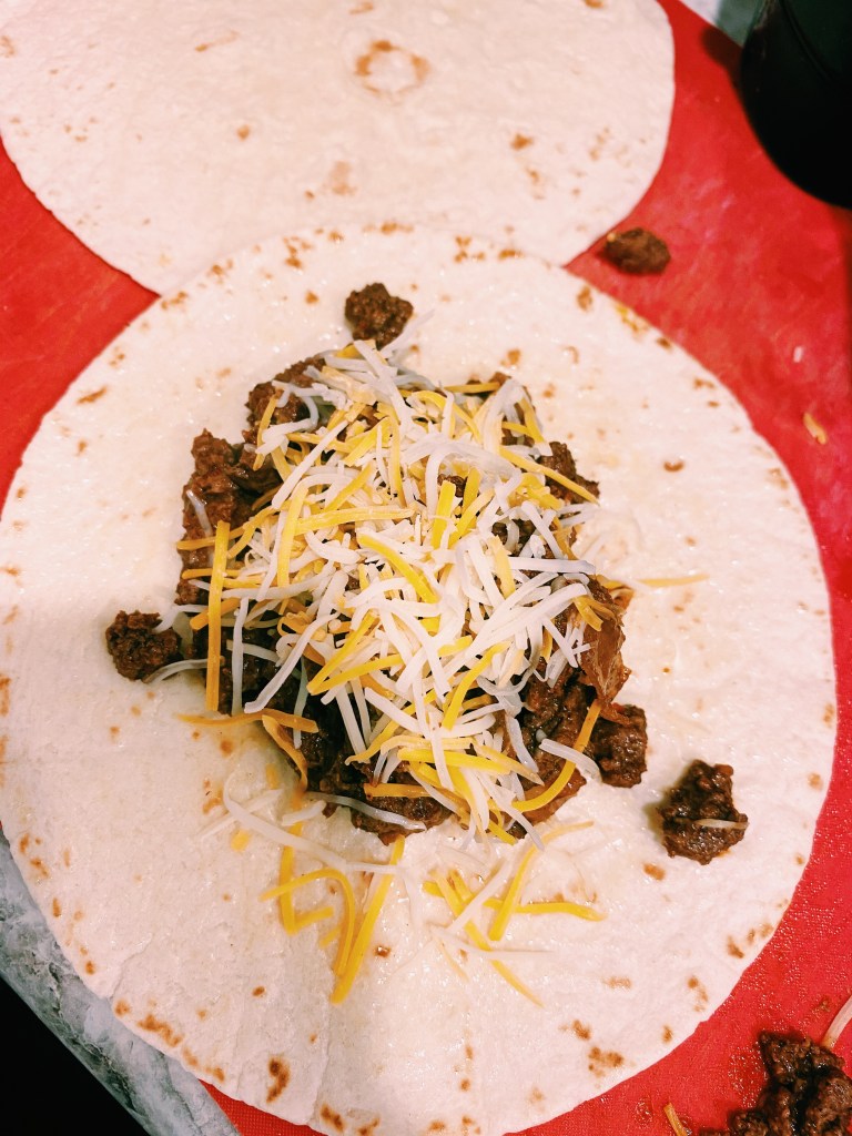 4.) Add 1 tbsp olive oil to a small dish. Brush both sides of each tortilla with olive oil to help the tortilla crisp up when placed in oven. Once brushed with olive oil, fill each tortilla with about 1/2 cup of meat and sprinkle with about an 1/8 cup cheese. (This is approximate! If you prefer your taquitos thinner, then obviously, place less meat in the tortillas.) Wrap tortillas and place on a nonstick sprayed baking sheet, roll side down so taquitos stay wrapped.