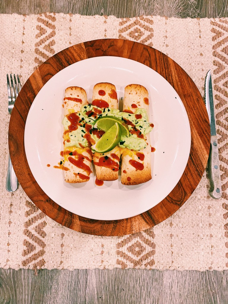 7.) When taquitos are done, remove from oven and plate. Top with avocado cream, taco sauce, and a sprinkle of cilantro. (I added the Ortega original taco sauce, so delicious!). If you’re looking for extra spice, you could add the Ortega hot taco sauce. Serve with a few lime wedges and enjoy!