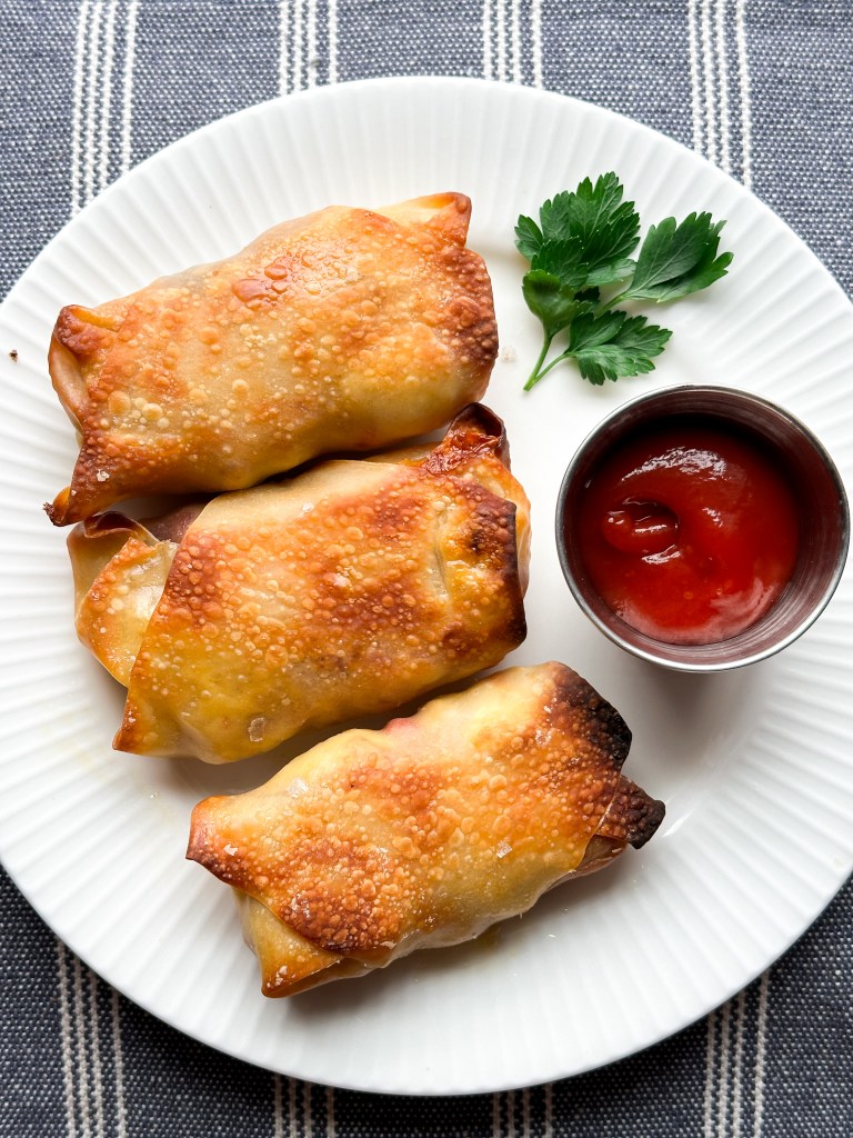 3.) Prepare eggroll wrappers by wetting the outside perimeter of the eggroll with water. Your finger will be the best tool for this. Add a large serving scoop (about 1/4 cup) of filling into wrapper. Top with 1/2 slice of havarti or sharp cheddar, up to you. Wrap eggrolls similarly to a burrito by placing the wrapper at an angle so one corner is facing you. Fold the corner up around the filling. Fold both sides up to encompass the filling and finish by rolling the egg roll so the sides are sealed.