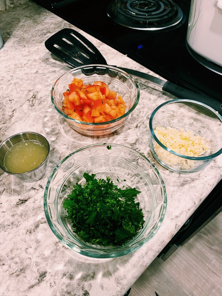 1.) To prep, smash and mince garlic cloves. Mince parsley. Dice tomato and juice one fresh lemon until 3 tablespoons of juice is collected. Set aside.