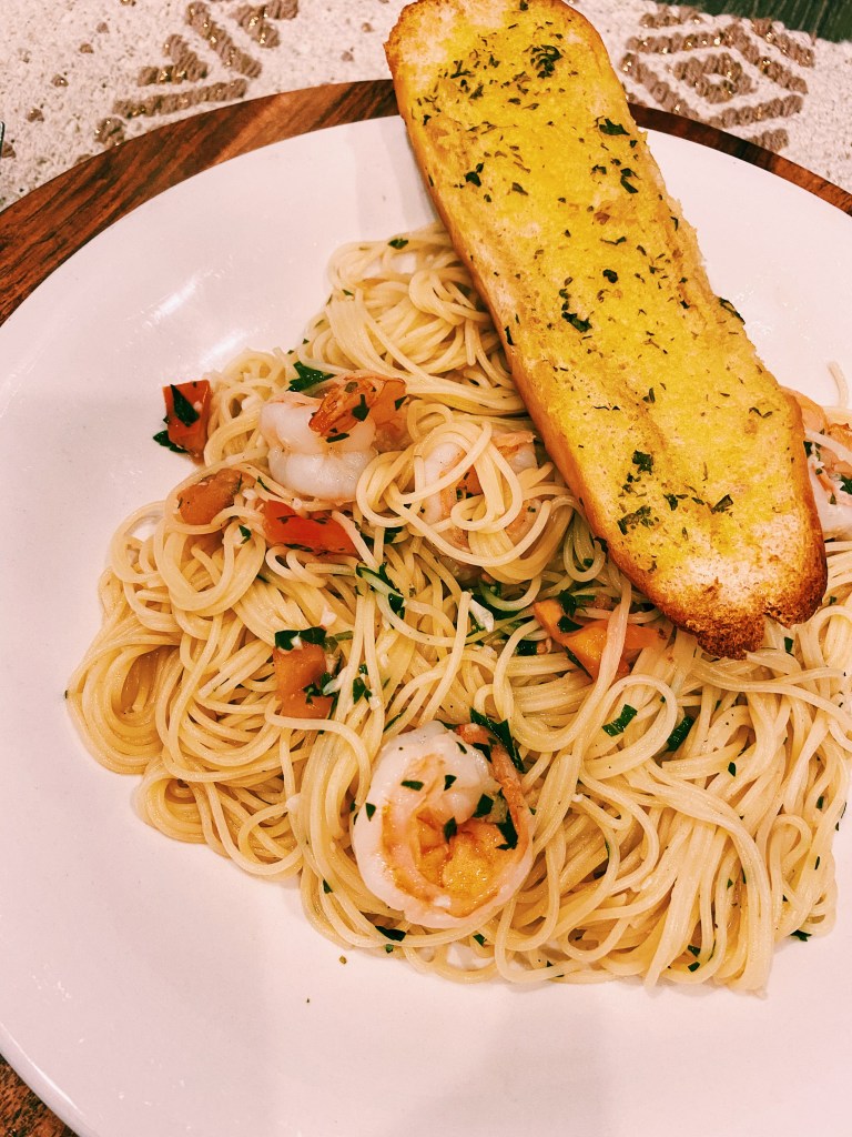 4.) Add shrimp and cook 2-3 minutes per side. Remove from pan when pink, tender, and curled. Continue to sauté garlic until lightly browned, about 5-6 minutes, stirring frequently. Fill a pot with salted water and let boil. Once boiling, add pasta and cook for required time. Before draining, reserve 1 cup of pasta water. Add pasta back into its cooking pot with a drizzle of olive oil to avoid sticking.