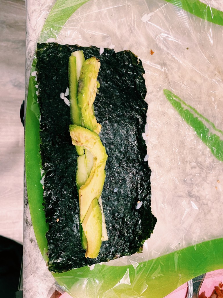 6.) I didn’t use a bamboo rolling mat only because I currently do not own one. However YOU CAN STILL MAKE SUSHI WITHOUT A ROLLING MAT. I use a flexible cutting board (thin plastic cutting board) wrapped in plastic wrap. Break nori in half and place on cutting board. Remove rice from freezer and fill a bowl with cold water. This will be to wet your hands to avoid the rice from sticking to your fingers. Spread a thin layer of rice (about half an inch high) evenly onto the nori. Sprinkle with sesame seeds. Flip sushi to other side of cutting board so nori is now face up and rice is face down (against the cutting board surface). This will allow you to prepare an uramaki (an inside out sushi roll).