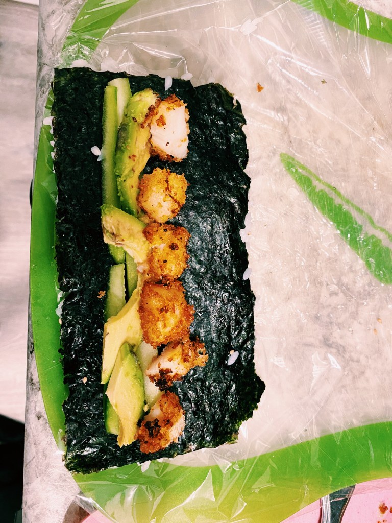 7.) Add 4 thin slices of cucumber, 3 slices of avocado, and about 4-5 pieces of seafood tempura. You might need to cut these in half again to fit into roll. Sprinkle lightly with salt. Make sure the edge of the roll is near the edge of the cutting board. Start rolling making sure to tuck fillings in before continuing to roll. This comes with practice, it might be difficult to get the hang of it at first, but I promise it becomes better with time. Make sure to remember to constantly wet your fingers or else the rice will stick to your hands and make it nearly impossible to keep the roll intact.