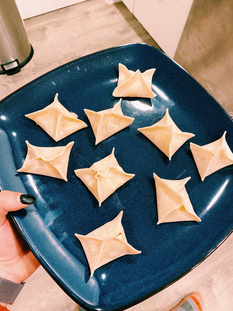 3.) Fold opposite corners of the wonton to reach each other and seal sides together. Repeat with the two remaining corners. Make sure to pinch the wrappers together tightly to create a good seal!