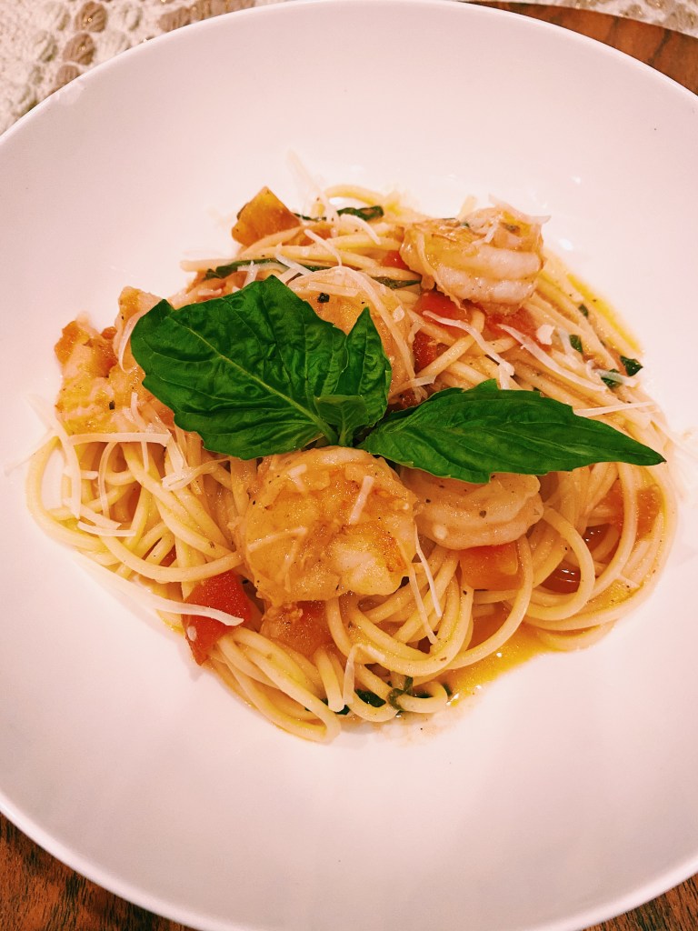 I love to experiment with different pasta dishes and as we transition into summer, I also like to also transition my dishes into lighter, fresher forms. For winter pasta dishes, I’ll start out with a heavy tomato base, but this Pomodoro has fresh tomatoes, shallots, basil, shrimp, and parmesan cheese as the star ingredients. Perfect warmed up the next day, you really can’t get much better than this!