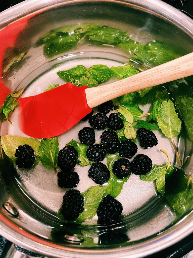 1.) In a large saucepan, add 1 cup of water, 1 cup of white granulated sugar, 1/2 cup fresh blackberries, and 1/2 cup mint.