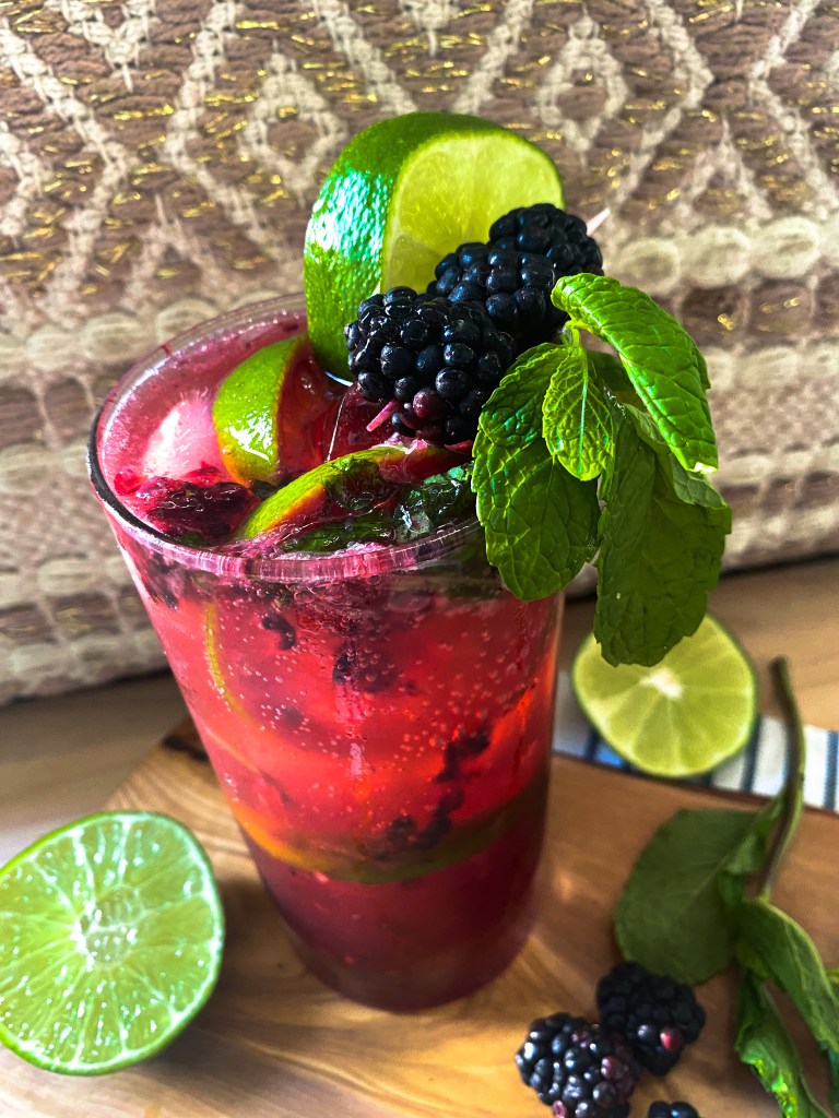 3.) Garnish with a lime slice, a sprig of mint, a 3 blackberries skewered onto a toothpick. Enjoy and sip responsibly!