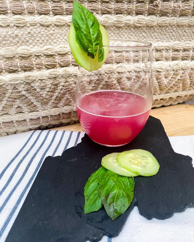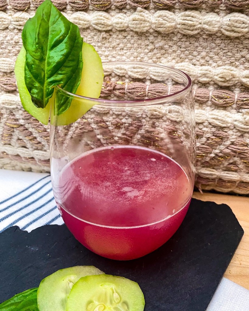 2.) Pour into chilled stemless wine glasses and garnish with cucumber slices and basil leaves. Enjoy and sip responsibly!