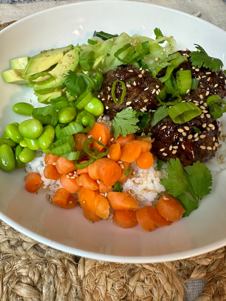 2.) Steam edamame. Boil carrots (if desired, or use raw). Slice avocado. Assemble our bowls with teriyaki meatballs, carrots, edamame, pickled cucumbers, avocado, and garnish with sesame seeds and green onion slices. Enjoy!