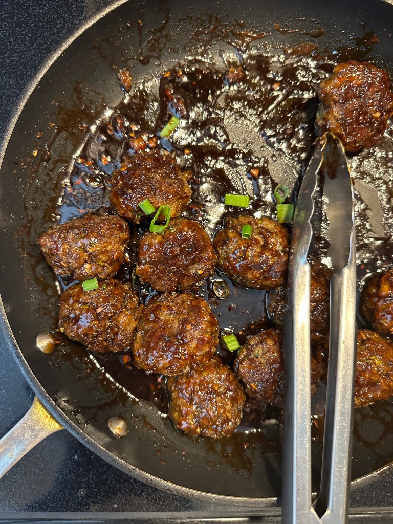 4.) In a small dish, combine cornstarch and water and mix into a slurry. Add to teriyaki sauce until you’ve reached the desired consistency. Transfer meatballs to frypan to coat with sauce. Stir carefully so as not to break meatballs. Serve and enjoy!