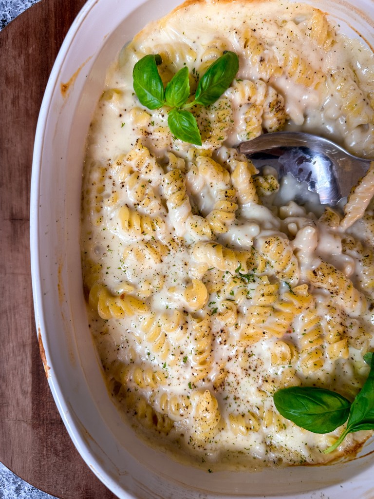 4.) Place pasta in an oven-safe casserole dish and top with cheese sauce. Mix together and place in oven for 30 to 35 minutes, until golden and bubbling. Let sit for 5 minutes before serving. Top with additional black pepper and enjoy!
