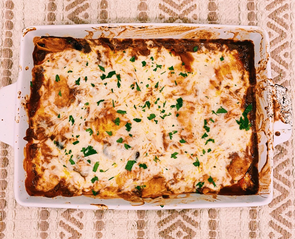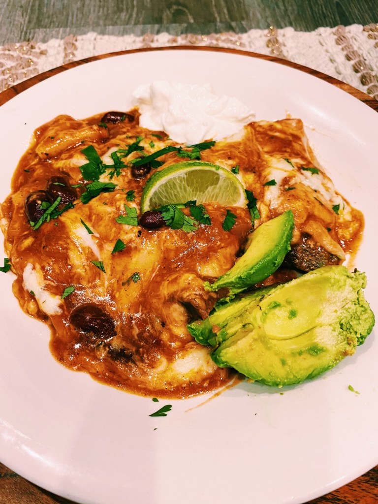 4.) Pour remaining enchilada filling over tortillas and sprinkle with mozzarella cheese. Cover tightly with aluminum foil and bake for 20 minutes. Remove foil and bake an additional 15 minutes. Remove from oven and let sit for 5 minutes. Top with fresh cilantro, lime juice, and serve with sour cream!