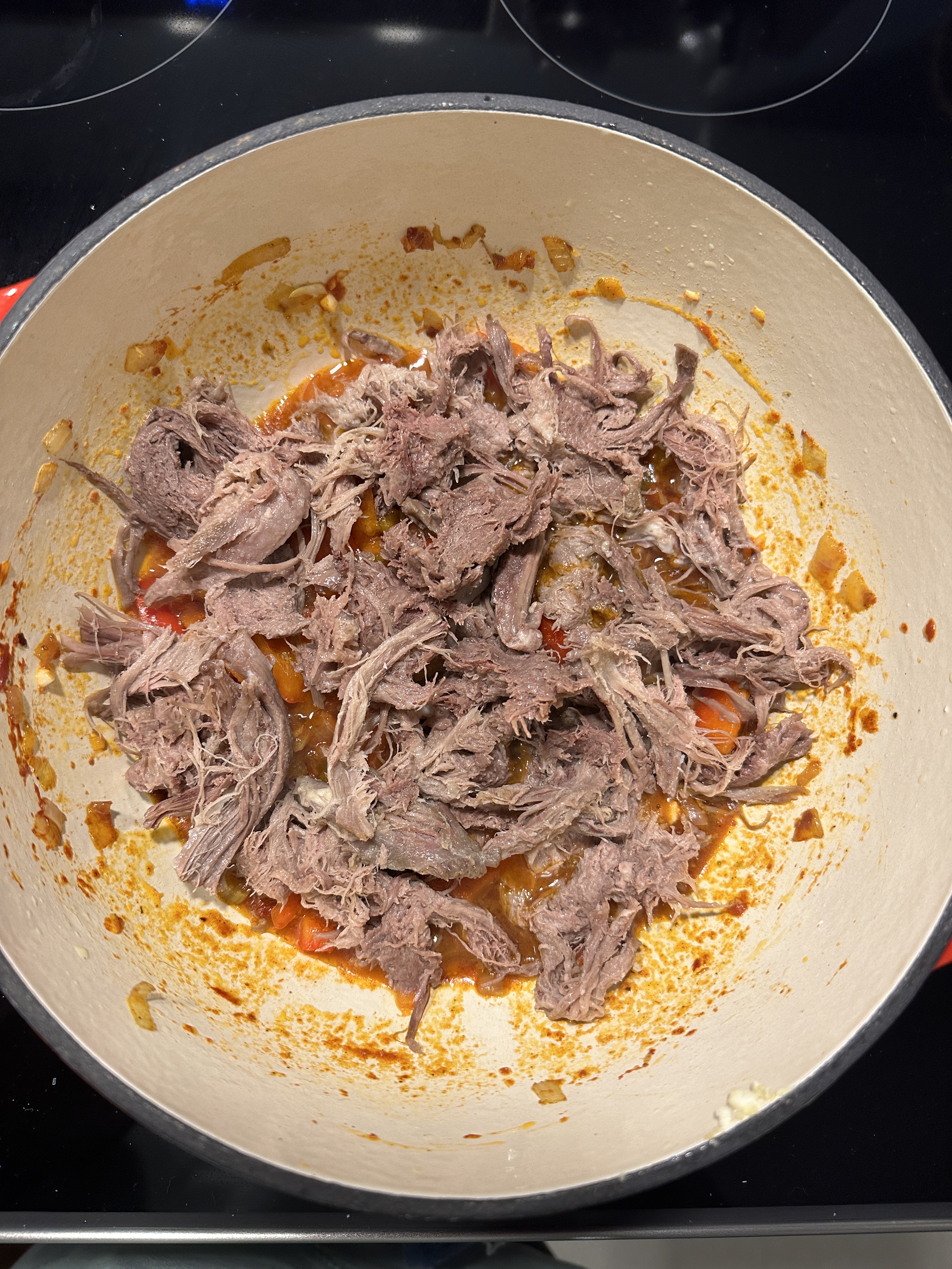 2.) Add tomato paste and butter to sautéed veggies and stir until incorporated. Add spices and sugar, along with diced bell pepper, minced garlic, and tongue meat to pan and cover and cook for 2 minutes. Add white wine to pot and stir to combine.